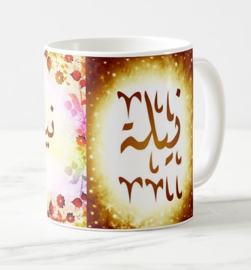 Mug avec le prénom Naïla calligraphié en arabe ainsi que son écriture normale en arabe (نيلة) et en français.