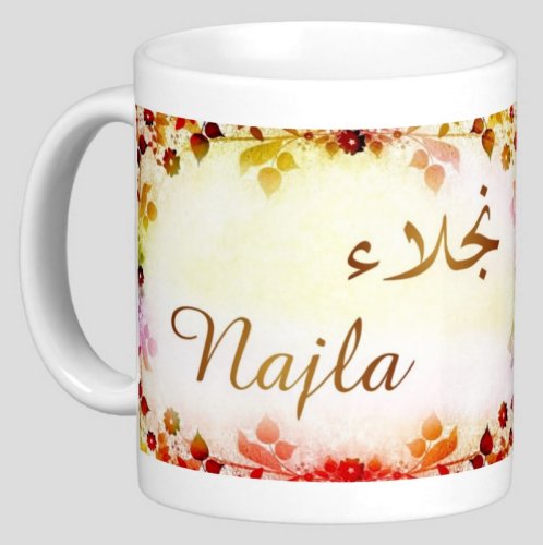 Mug avec le prénom "Najla" écrit en français, en arabe (نجلاء) et calligraphié de façon artistique en arabe sur la partie droite.