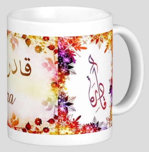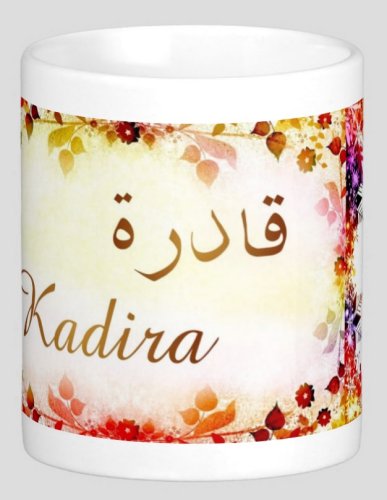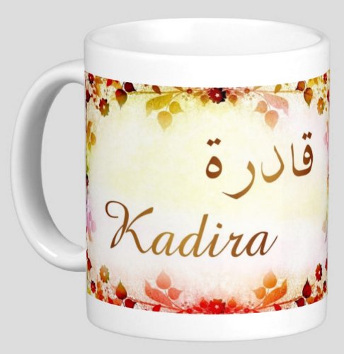 Mug avec le prénom "Qadira" écrit en français, en arabe (قادرة) et calligraphié de façon artistique en arabe sur la partie droite.