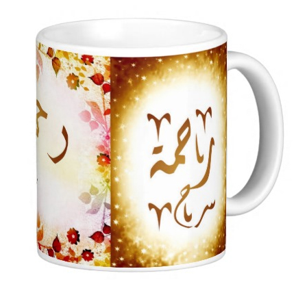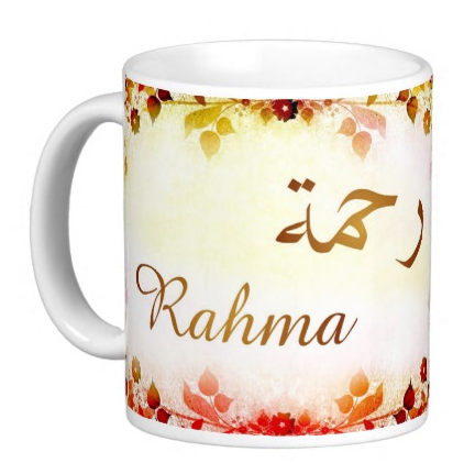 Mug avec le prénom "Rahma" écrit en français, en arabe (رحمة) et calligraphié de façon artistique en arabe sur la partie droite.