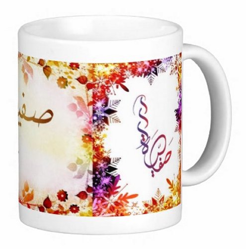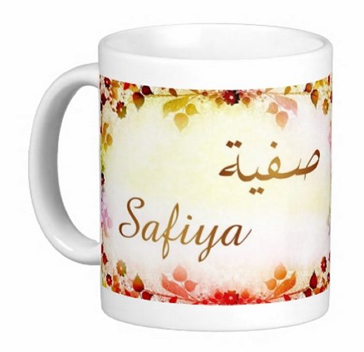Mug avec le prénom "Safiya" écrit en français, en arabe (صفية) et calligraphié de façon artistique en arabe sur la partie droite.
