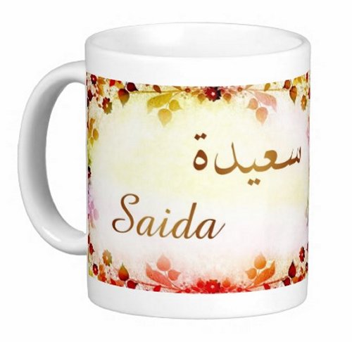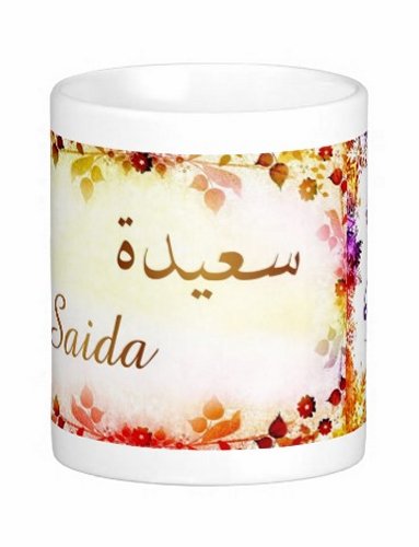 Mug avec le prénom "Saida" écrit en français, en arabe (سعيدة) et calligraphié de façon artistique en arabe sur la partie droite.