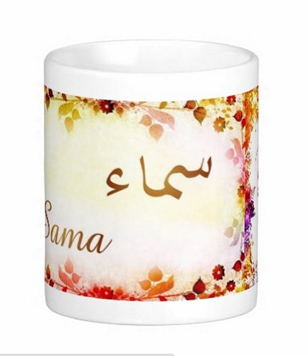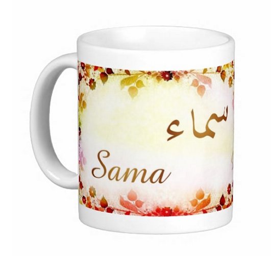 Mug avec le prénom "Sama" écrit en français, en arabe (سماء) et calligraphié de façon artistique en arabe sur la partie droite.