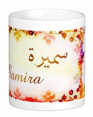 Mug avec le prénom "Samira" écrit en français, en arabe (سميرة) et calligraphié de façon artistique en arabe sur la partie droite.