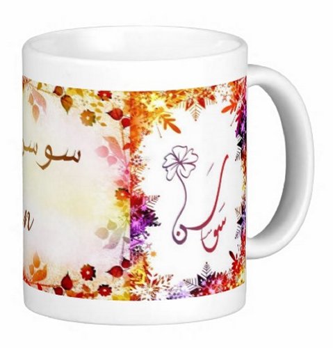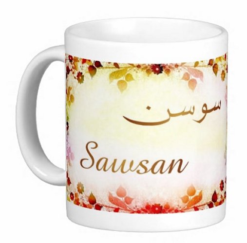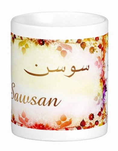 Mug avec le prénom "Sawsan" écrit en français, en arabe (سوسن) et calligraphié de façon artistique en arabe sur la partie droite.