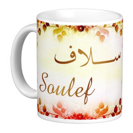 Mug avec le prénom "Soulef" écrit en français, en arabe (سلاف) et calligraphié de façon artistique en arabe sur la partie droite.