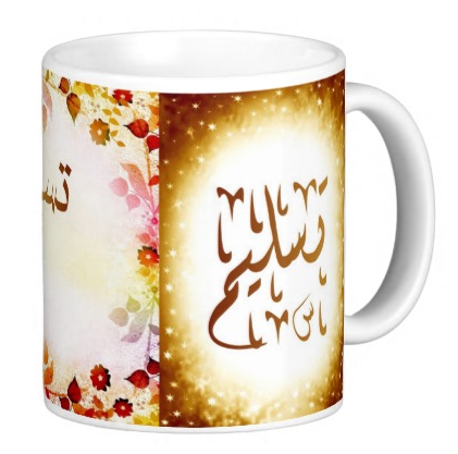 Mug avec le prénom "Taslime" écrit en français, en arabe (تسليم) et calligraphié de façon artistique en arabe sur la partie droite.
