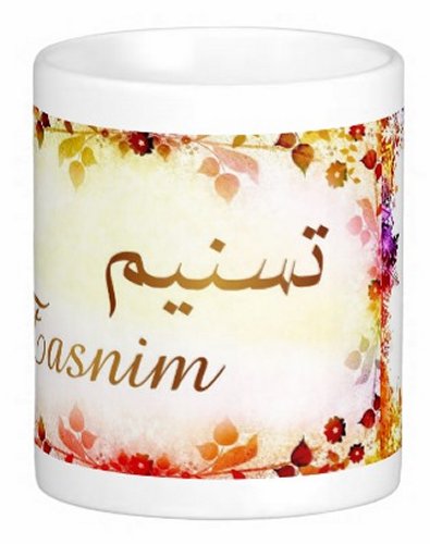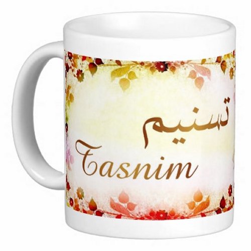 Mug avec le prénom "Tasnim" écrit en français, en arabe (تسنيم) et calligraphié de façon artistique en arabe sur la partie droite.