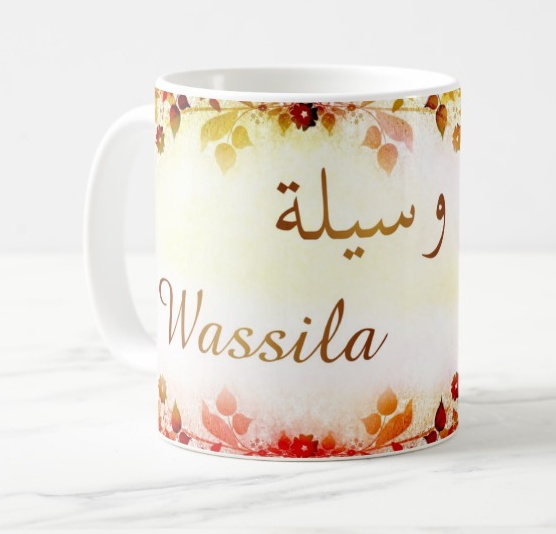 Mug avec le prénom "Wassila" écrit en français, en arabe (وسيلة) et calligraphié de façon artistique en arabe sur la partie droite.