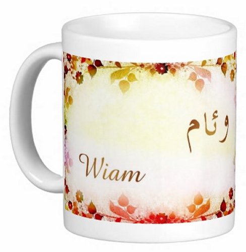 Mug avec le prénom "Wiam" écrit en français, en arabe (وئام) et calligraphié de façon artistique en arabe sur la partie droite.