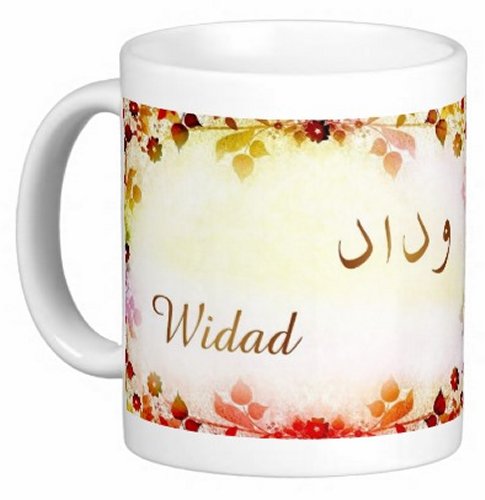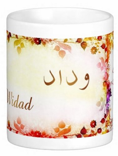 Mug avec le prénom "Widad" écrit en français, en arabe (وداد) et calligraphié de façon artistique en arabe sur la partie droite.