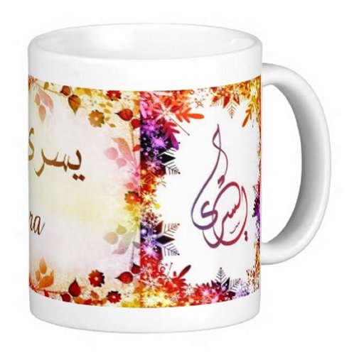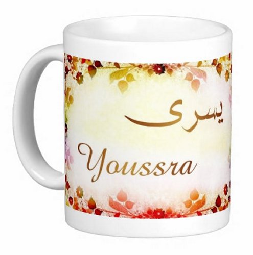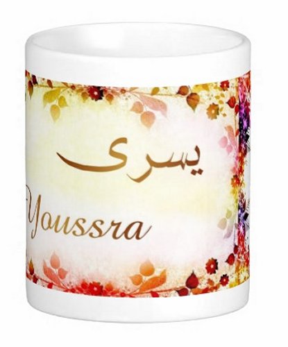 Mug avec le prénom "Youssra" écrit en français, en arabe (يسرى) et calligraphié de façon artistique en arabe sur la partie droite.
