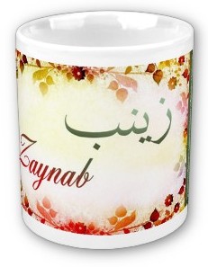 Mug avec le prénom Zaynab calligraphié en arabe (زينب) ainsi que son épellation lettre par lettre en arabe.