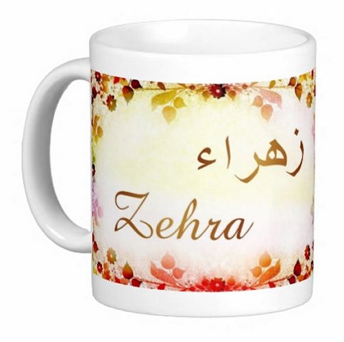 Mug avec le prénom "Zehra" écrit en français, en arabe (زهرة) et calligraphié de façon artistique en arabe sur la partie droite.