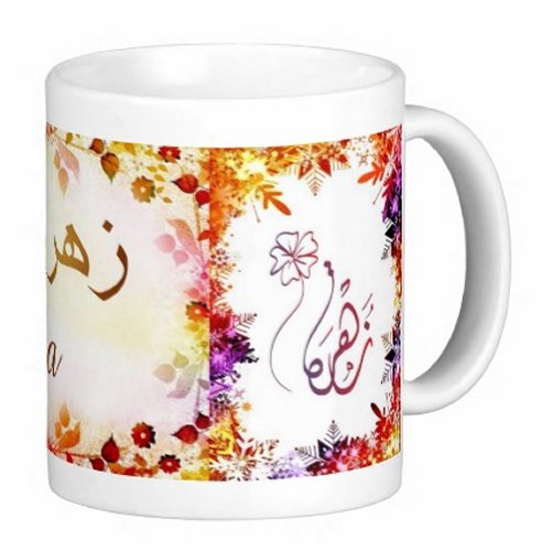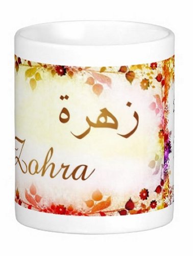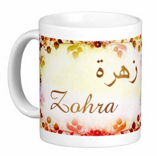 Mug avec le prénom "Zohra" écrit en français, en arabe (زهرة) et calligraphié de façon artistique en arabe sur la partie droite.