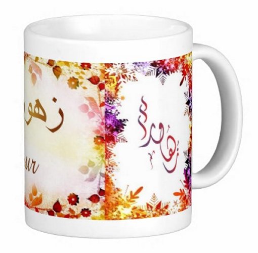 Mug avec le prénom "Zouhour" écrit en français, en arabe (زهور) et calligraphié de façon artistique en arabe sur la partie droite.