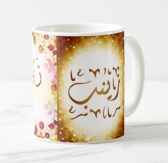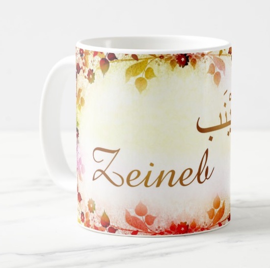 Mug avec le prénom "Zeineb" écrit en français, en arabe (زينب) et calligraphié de façon artistique en arabe sur la partie droite.