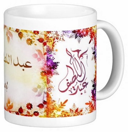Mug avec le prénom "Abd-El-Latif" écrit en français, en arabe (عبد اللطيف) et calligraphié de façon artistique en arabe sur la partie droite.