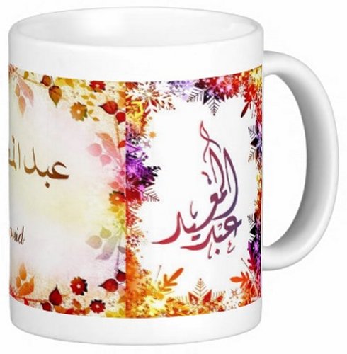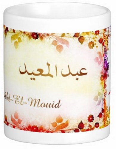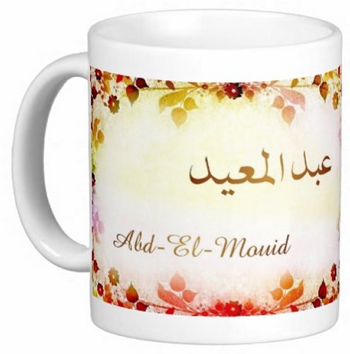 Mug avec le prénom "Abd-El-Mouid" écrit en français, en arabe (عبد المعيد) et calligraphié de façon artistique en arabe sur la partie droite.