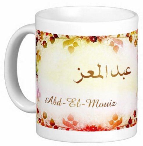 Mug avec le prénom "Abd-El-Mouiz" écrit en français, en arabe (عبد المعز) et calligraphié de façon artistique en arabe sur la partie droite.