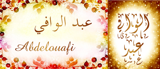 Mug avec le prénom "Abdelouafi" écrit en français, en arabe (عبد الوافي) et calligraphié de façon artistique en arabe sur la partie droite.