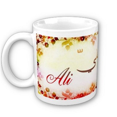 Mug avec le prénom "Ali" calligraphié en arabe (عليّ) ainsi que son épellation lettre par lettre en arabe.