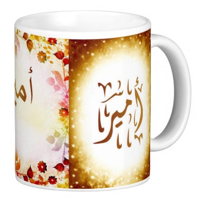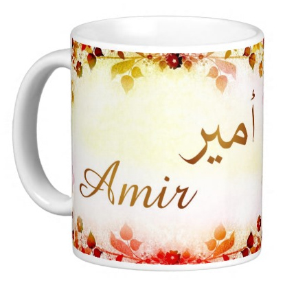 Mug avec le prénom "Amir" écrit en français, en arabe (أمير) et calligraphié de façon artistique en arabe sur la partie droite.