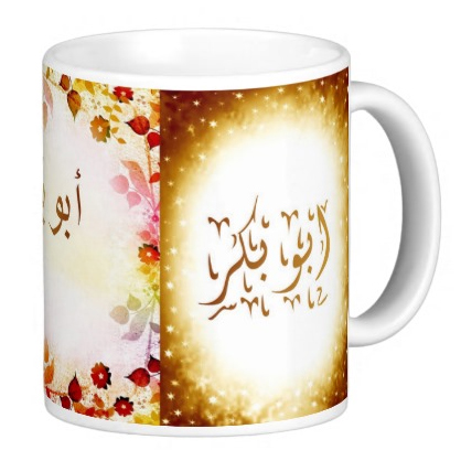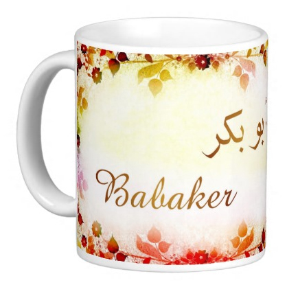 Mug avec le prénom "Babaker" écrit en français, en arabe (أبو بكر) et calligraphié de façon artistique en arabe sur la partie droite.