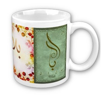 Mug avec le prénom "Bilal" calligraphié en arabe (بلال) ainsi que son épellation lettre par lettre en arabe.
