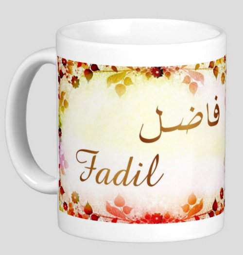 Mug avec le prénom "Fadil" écrit en français, en arabe (فاضل) et calligraphié de façon artistique en arabe sur la partie droite.