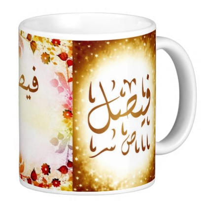Mug avec le prénom "Faycal" écrit en français, en arabe (فيصل) et calligraphié de façon artistique en arabe sur la partie droite.