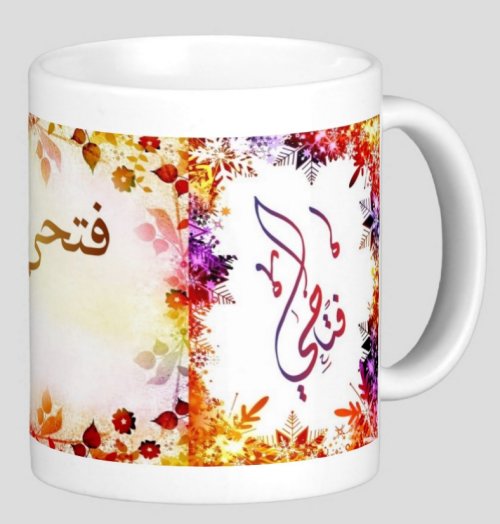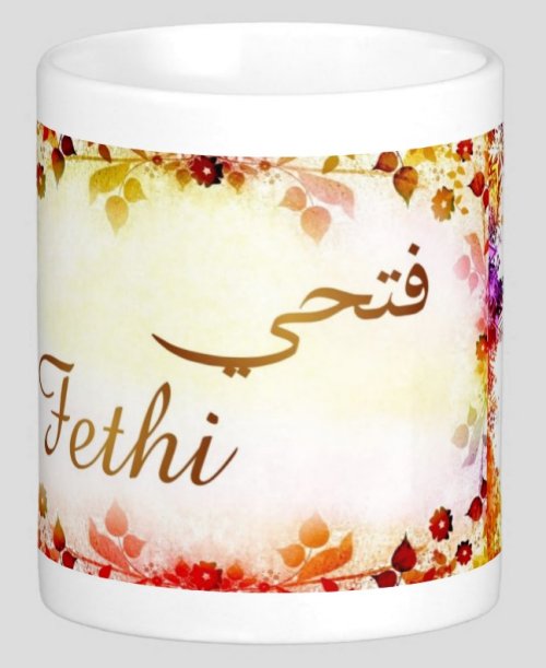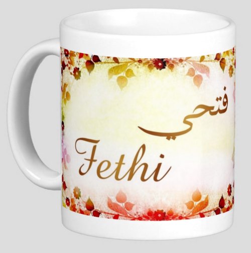 Mug avec le prénom "Fethi" écrit en français, en arabe (فتحي) et calligraphié de façon artistique en arabe sur la partie droite.