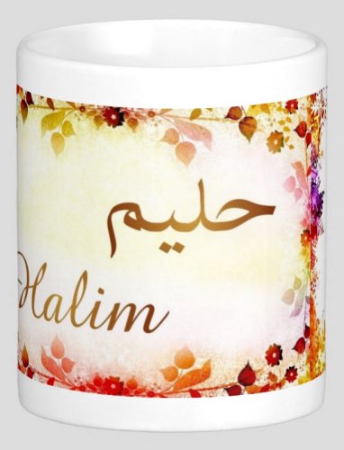 Mug avec le prénom "Halim" écrit en français, en arabe (حليم) et calligraphié de façon artistique en arabe sur la partie droite.