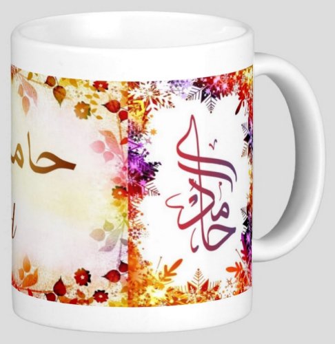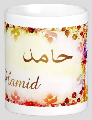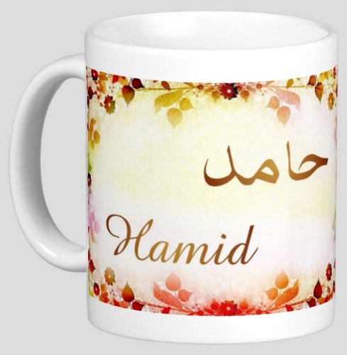 Mug avec le prénom "Hamid" écrit en français, en arabe (حامد) et calligraphié de façon artistique en arabe sur la partie droite.