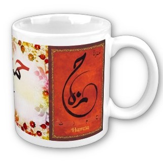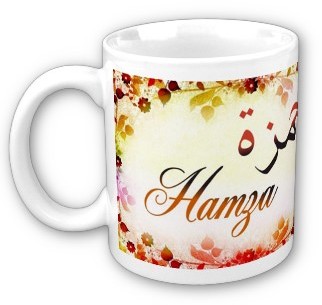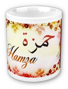 Mug avec le prénom masculin Hamza calligraphié en arabe (حمزة) ainsi que son épellation lettre par lettre en arabe.
