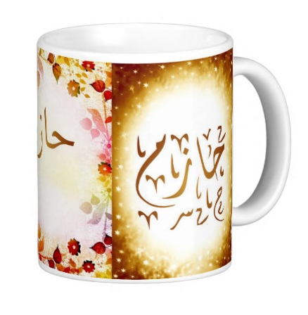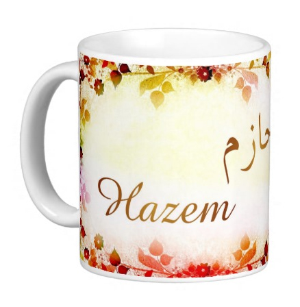 Mug avec le prénom "Hazem" écrit en français, en arabe (حازم) et calligraphié de façon artistique en arabe sur la partie droite.