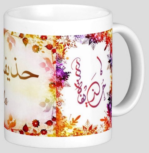 Mug avec le prénom "Houdaifa" écrit en français, en arabe (حذيفة) et calligraphié de façon artistique en arabe sur la partie droite.
