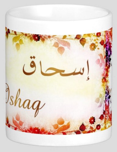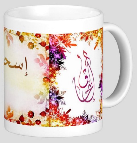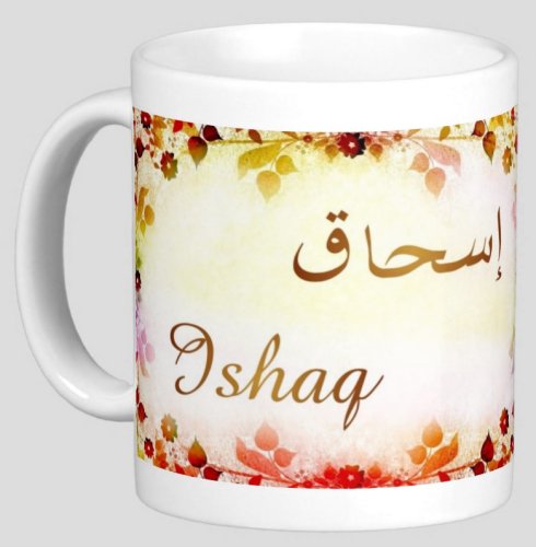 Mug avec le prénom "Ishaq" écrit en français, en arabe (إسحاق) et calligraphié de façon artistique en arabe sur la partie droite.