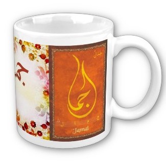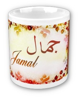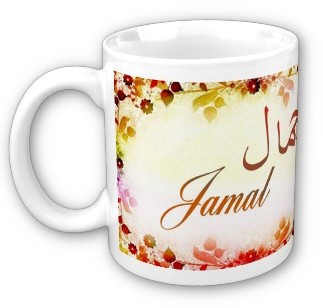 Mug avec le prénom masculin Jamal calligraphié en arabe (جمال) ainsi que son épellation lettre par lettre en arabe.