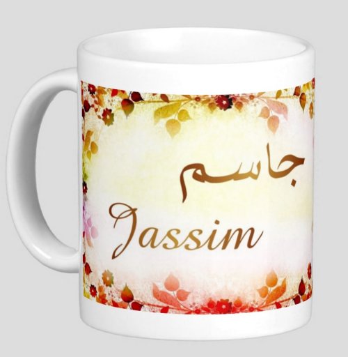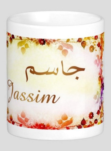 Mug avec le prénom "Jassim" écrit en français, en arabe (جاسم) et calligraphié de façon artistique en arabe sur la partie droite.