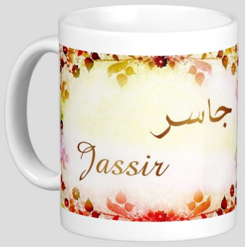 Mug avec le prénom "Jassir" écrit en français, en arabe (جاسر) et calligraphié de façon artistique en arabe sur la partie droite.