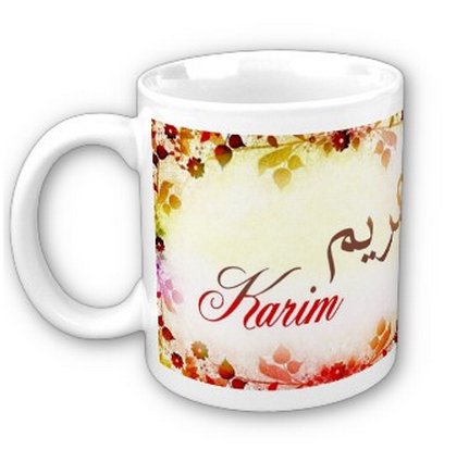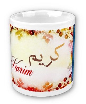 Mug avec le prénom Karim calligraphié en arabe (كريم) ainsi que son épellation lettre par lettre en arabe.