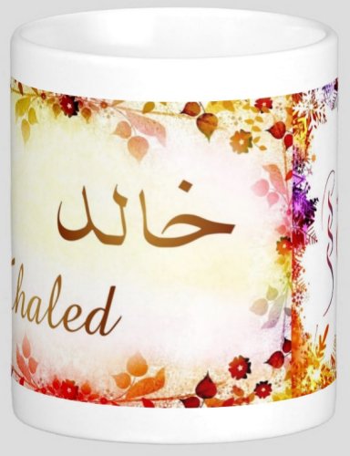 Mug avec le prénom "Khaled" écrit en français, en arabe (خالد) et calligraphié de façon artistique en arabe sur la partie droite.