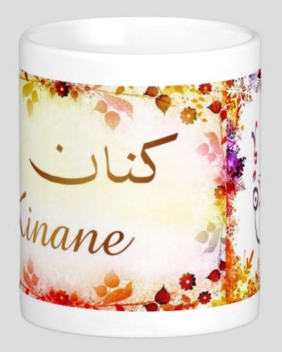 Mug avec le prénom "Kinane" écrit en français, en arabe (كنان) et calligraphié de façon artistique en arabe sur la partie droite.