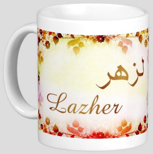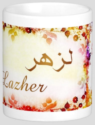 Mug avec le prénom "Lazhar" écrit en français, en arabe (لزهر) et calligraphié de façon artistique en arabe sur la partie droite.