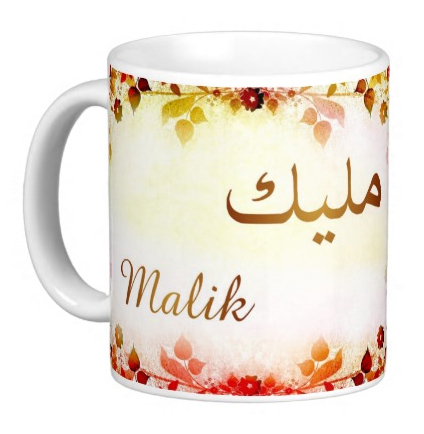 Mug avec le prénom "Malik" écrit en français, en arabe (مليك) et calligraphié de façon artistique en arabe sur la partie droite