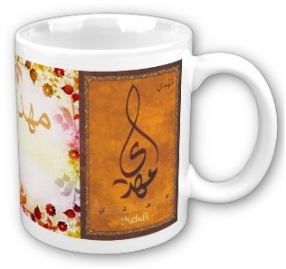 Mug avec le prénom "Mehdi" calligraphié en arabe (مهدي) ainsi que son épellation lettre par lettre en arabe.