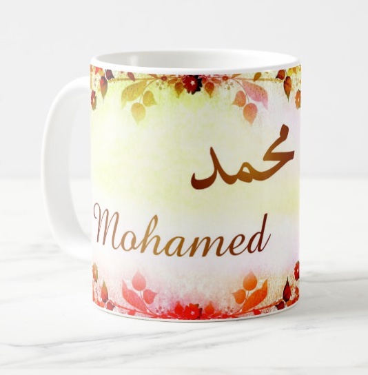 Mug avec le prénom Mohamed calligraphié en arabe ainsi que son écriture normale en arabe (محمد) et en français.