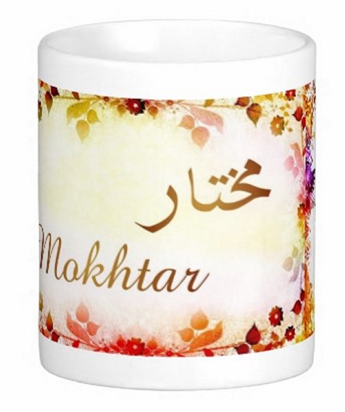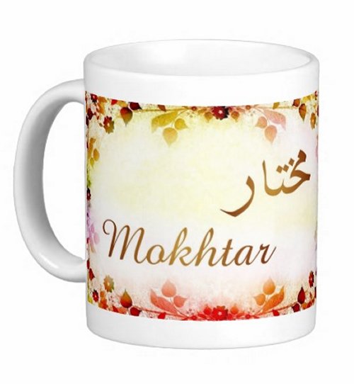 Mug avec le prénom "Mokhtar" écrit en français, en arabe (مختار) et calligraphié de façon artistique en arabe sur la partie droite.