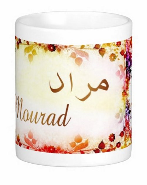 Mug avec le prénom "Mourad" écrit en français, en arabe (مراد) et calligraphié de façon artistique en arabe sur la partie droite.